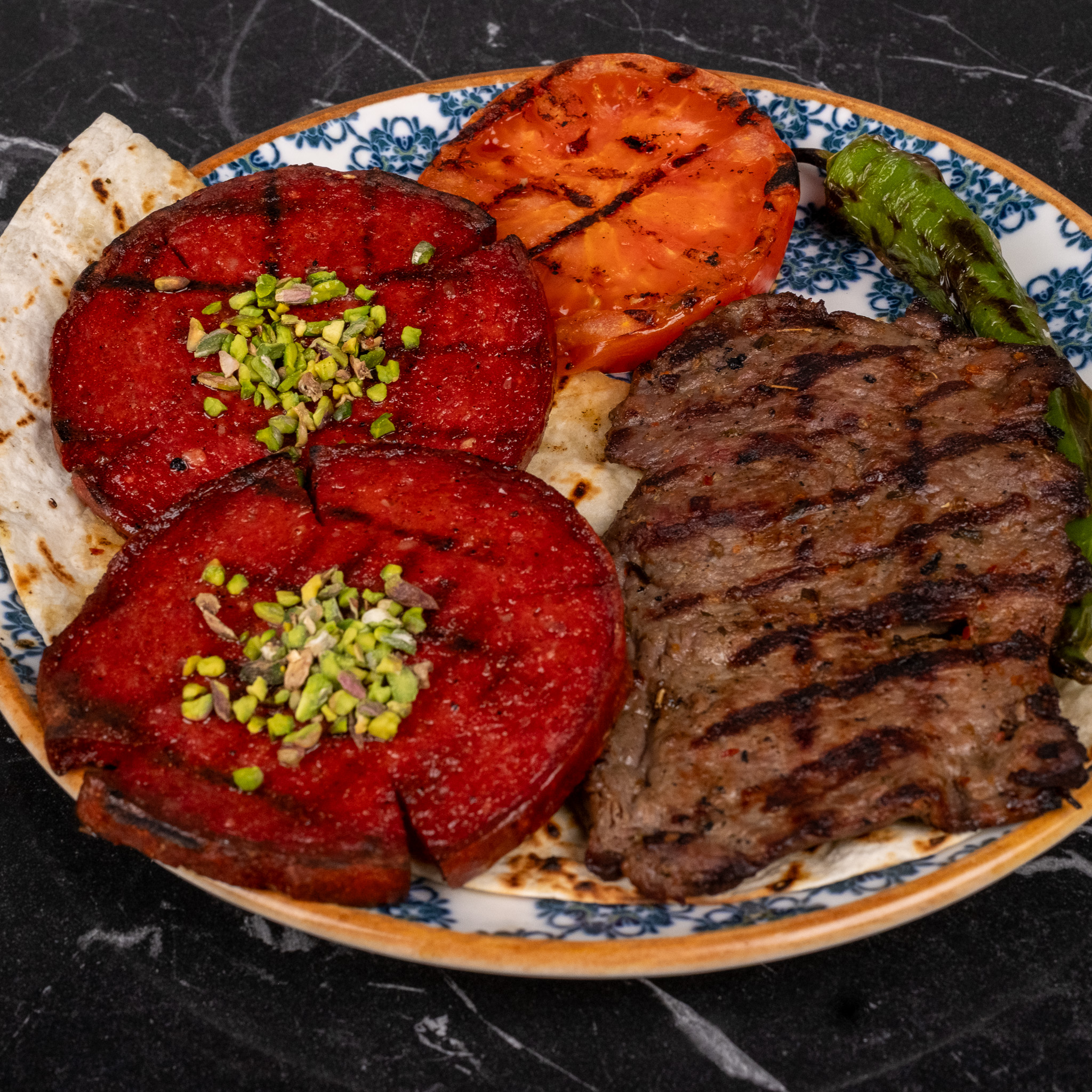100 gr dana biftek,100 gr osmanlı sucuk,közlenmiş domates,kozlenmiş biber ve yanında salata ile acukayla servis edilir